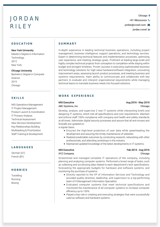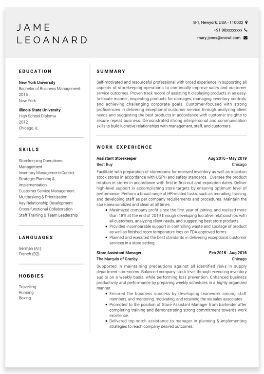 Hiring Managers expect information to appear in standard formats or close to it. Many companies and Job Portals use ATS (Applicant Tracking System), searches for keywords and don't recognize certain types of layouts, odd-shaped bullet points, columns, or creative fonts. Try our easy-to-use CV Maker that comes with professional Resume templates.