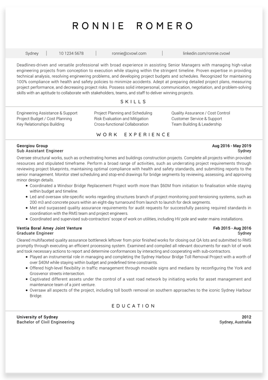 Our resume templates are compliant with Application Tracking System (ATS) so that the chances of your resume getting shortlisted increases. ATS-compliant resumes are higher chances of getting noticed by recruiters. Added to this, CVOwl is an automated tool where industry-relevant keywords are incorporated to even further increase the chances of getting shortlisted during automated screening, very commonly used by recruiters these days.